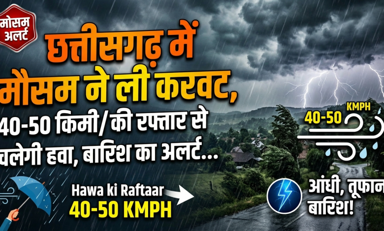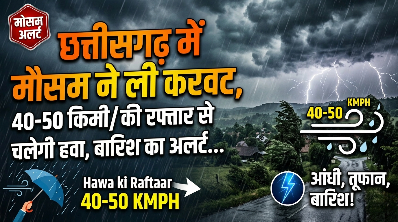 छत्तीसगढ़ मौसम अपडेट : प्रदेश में मौसम ने करवट ले ली है। आगामी 24 घंटों के दौरान और बदलाव आ सकते हैं। मौसम विभाग ने चेतावनी जारी की है कि एक-दो स्थानों पर 40 से 50 किलोमीटर प्रति घंटा की रफ्तार से तेज हवा चलने की संभावना है। रायपुर सहित कई जिलों में गरज-चमक, वज्रपात, हल्की से मध्यम बारिश और ओलावृष्टि होने के आसार बने हैं।