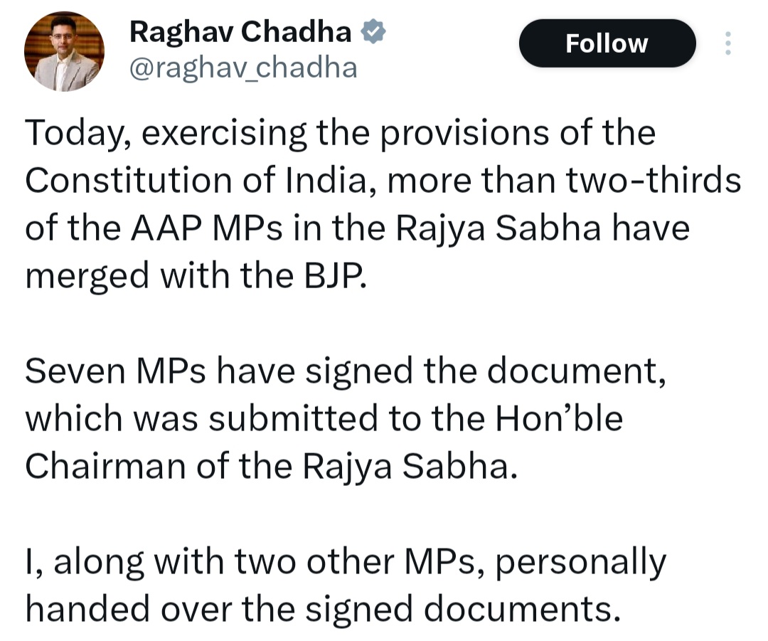 ​राघव चड्ढा ने सोशल मीडिया प्लेटफॉर्म X (ट्विटर) पर इसकी जानकारी देते हुए लिखा कि उन्होंने भारतीय संविधान की दसवीं अनुसूची (Anti-Defection Law) के प्रावधानों के तहत यह कदम उठाया है। कानून के मुताबिक, यदि किसी पार्टी के दो-तिहाई सदस्य एक साथ पाला बदलते हैं, तो उनकी सदस्यता रद्द नहीं होती।
