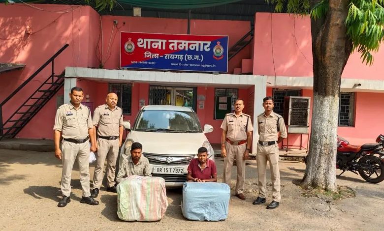 रायगढ़ : वरिष्ठ पुलिस अधीक्षक श्री शशि मोहन सिंह के दिशा निर्देशन में जिले में अवैध मादक पदार्थों के विरुद्ध चलाए जा रहे अभियान “आघात” के तहत पुलिस को एक बड़ी सफलता हाथ लगी है। दिनांक 19 अप्रैल 2026 को थाना तमनार और साइबर टीम ने धौराभांठा मेन रोड पर नाकेबंदी कर ओडिशा से गांजा की तस्करी कर रहे दो आरोपियों को गिरफ्तार करते हुए उनके कब्जे से 60 किलोग्राम गांजा, कार और अन्य सामग्री सहित कुल करीब 20 लाख 24 हजार 750 रुपये की संपत्ति जब्त की है।