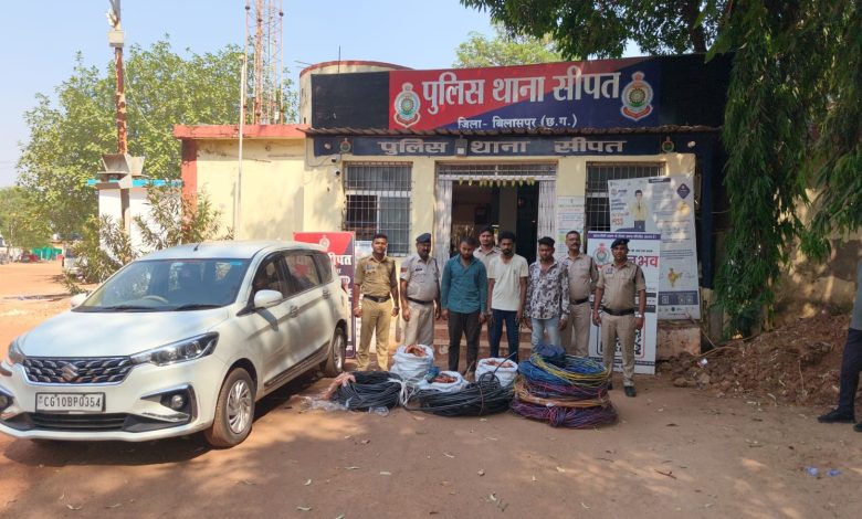 सीपत : दिनांक 19.04.2026 को मुखबिर से सूचना मिली की ग्राम खम्हरिया के सोंठी रोड बाजार के पास कुछ लड़कों की गतिविधियां संदिग्ध है वे दिन में रूम में रहते हैं और रात के समय एक आर्टिका कार से घूमने निकलते हैं सूचना पर तत्काल थाना प्रभारी सीपत के द्वारा टीम तैयार कर आरोपियों को पकडने के निर्देश मिलने पर आरोपी शहबाज अली एवं उसके अन्य साथी को घेरा बंदी कर पकड़ा गया और उन्हें हिरासत में लेकर पूछताछ किया गया जो शुरू में तो गुमराह करने की कोशिश किए परंतु ज्यादा देर तक झूठ नहीं बोल पाए हिकमतमली से पूछताश करने पर बताए कि वे चार पांच माह पूर्व से शहबाज अली अपने साथी 1. जगदीश कुमार पटेल पिता दुजराम पटेल उम्र 24 साल निवासी ग्राम खम्हरिया थाना सीपत 2. मोईउद्दीन पिता समसुद्दीन उम्र 27 साल निवासी खम्हरिया थाना सीपत एवं तीन अपचारी बालको के साथ मिलकर एक सफेद रंग की आर्टीका कार में धूमधुम कर तखतपुर, काठाकोनी, चोरभट्ठी, गनियारी, जयाराम नगर मुंगेली जिलों में कई जगहों पर,कुंडा कबीरधाम , अकलतरा कोरबा आदि जगहो से मोबाईल टावर में लगे केबल कॉपर वायर और एल्युमिनियम तार को चोरी कर रहे हैं आरोपियों की निशान देही पर उनसे चोरी का सामन, छीला हुआ कापर केबल वायर वजन 1क्विंटल दो किलोग्राम कीमती 1,22,400 रूपये, काले रंग के प्लास्टिक कोडेड कापर वायर का बंडल वजन 54 किलोग्राम कीमती 1,08,000 रूपये, बारह बंडल एल्युमिनीयम का तार कीमती 60,000 रूपये जुमला कीमती 2,90,400 रूपये को और एक आर्टिका कार सफेद रंग की बरामद किया गया आरोपियो को गिरफ्तार कर न्यायिक रिमांड पर एवं अपचारी बालको को किशोर न्याय बोर्ड बिलासपुर भेजा गया।