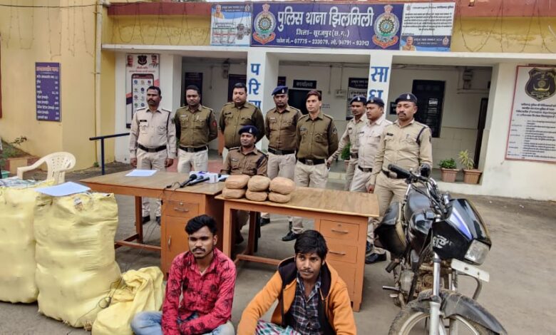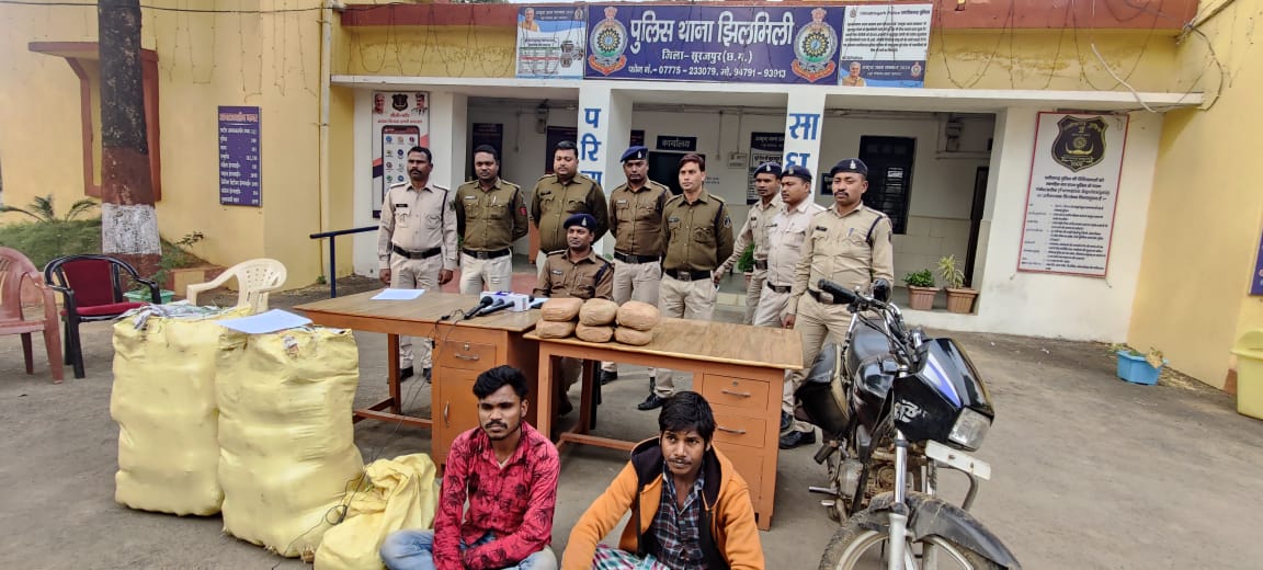 सूरजपुर। अवैध कार्याे के विरूद्व प्रभावी कार्यवाही को लेकर *पुलिस अधीक्षक भावना गुप्ता* के सख्त निर्देश पर नशे के कारोबार से जुड़े व्यक्तियों पर निरंतर कार्यवाही जारी है। अतिरिक्त पुलिस अधीक्षक हरीश राठौर व एसडीओपी ओड़गी राजेश जोशी के मार्गदर्शन में गुरूवार को झिलमिली पुलिस ने मुखबीर की सूचना पर ग्राम खाड़ापारा में घेराबंदी लगाया तभी एक मोटर सायकल में 2 व्यक्ति आते दिखे, पुलिस को देखकर पीछे बैठा व्यक्ति भाग निकला। पुलिस टीम ने मोटर सायकल सहित सरोज सिरदार उम्र 24 वर्ष ग्राम टाकर, थाना प्रेमनगर को पकड़ा जिसके कब्जे से 14 किलो मादक पदार्थ गांजा जप्त किया गया। पकड़े गए आरोपी के निशानदेही पर ग्राम टाकर निवासी 30 वर्षीय अमृत राम के घर पर विधिवत दबिश दी गई जहां से 70 किलो गांजा बरामद किया गया। प्रकरण में कुल 84 किलो गांजा कीमत 8,40,000/- रूपये व परिवहन में प्रयुक्त मोटर सायकल को जप्त कर धारा 20(बी) एनडीपीएस एक्ट के तहत कार्यवाही करते हुए आरोपी सरोज सिरदार व अमृत राम को विधिवत गिरफ्तार किया गया। मामले में फरार 1 अन्य आरोपी की पतासाजी सरगर्मी से की जा रही है।