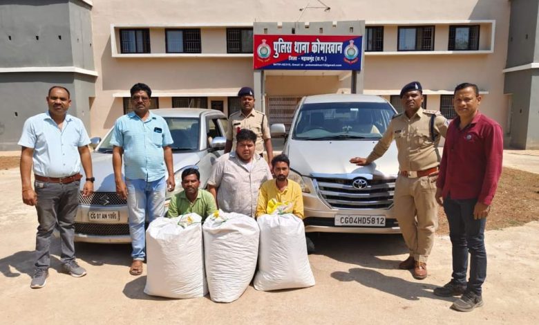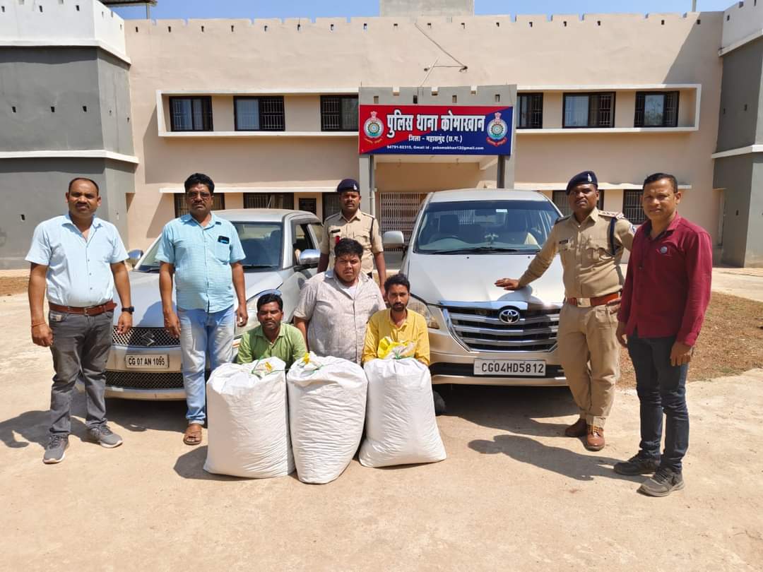 महासमुन्द : थाना कोमाखान द्वारा आज दिनांक 01.03.2024 को हमराह स्टाफ के शासकीय वाहन क्रमांक CG 04 PG 3515 के पेट्रोलिंग पर सुवरमाल की ओर रवाना हुआ था कि जरिये मुखबीर से सूचना मिला कि एक सिल्वर रंग की स्वीफ्ट डिजायर कार क्रमांक CG 07 AN 1095 में दो व्यक्ति एवं एक सिल्वर गोल्ड रंग की इनोवा कार क्रमांक CG 04 HD 5812 में एक व्यक्ति मादक पदार्थ गांजा लेकर उड़ीसा राज्य से बागबाहरा की ओर आ रही है कि सूचना पर कोमाखान चौखडी पहुंचे!बाद ओडिसा की ओर से बागबाहरा की तरफ एक सिल्वर रंग की स्वीफ्ट डिजायर कार क्रमांक CG 07 AN में दो व्यक्ति एवं कार के पिछे एक सिल्वर गोल्ड रंग की इनोवा कार क्रमांक CG 04 HD 5812 में एक व्यक्ति सवार होकर आये दोनो वाहन को रोककर नाम पता पूछने पर वाहन स्वीफ्ट डिजायर कार क्रमांक CG 07 AN 1095 के चालक ने अपना नाम मुकेश साहू पिता स्व0 रमेश साहू उम्र 32 वर्ष साकिन वार्ड क्रमांक 09 कृष्णा नगर बजरंग चौक, बजरंग किराया भंडार, थाना सुपेला, भिलाई दुर्ग । एवं बगल सीट मे बैठे व्यक्ति ने अपना नाम संपत सागर पिता मनहरण सागर उम्र 35 वर्ष साकिन वार्ड क्रमांक 08 मिनिमाता चौक कृष्णा नगर, निर्मल सायकल के पास थाना सुपेला भिलाई दुर्ग । एवं इनोवा कार क्रमांक CG 04 HD 5812 के चालक ने अपना नाम नंद किशोर साहू पिता जोधाराम साहू उम्र 34 वर्ष साकिन वार्ड क्रमांक 09 कृष्णा नगर, बजरंग चौक, विक्की किराना दुकान थाना सुपेला भिलाई दुर्ग का निवासी होना बताये एवं पुछताछ करने पर गोल मोल जवाब देने लगा कडाई से पुछताछ करने पर स्वीफ्ट डिजायर की पीछे डिक्की में अवैध मादक पदार्थ गांजा को रखकर उड़ीसा राज्य से जबलपुर (म.प्र.) में बिक्री करने ले जाना बताये तथा इनोवा कार क्रमांक CG 04 HD 5812 को पायलेटिंग के लिये रखना व खाली होना बताये । आरोपीणों के संयुक्त कब्जे से अवैध मादक पदार्थ 60 कि.ग्राम गांजा, घटना में प्रयुक्त वाहन स्वीफ्ट डिजायर कार क्रमांक CG 07 AN एवं इनोवा कार क्रमांक CG 04 HD 5812, चार नग मोबाईल, नगदी रकम 900 रूपये कुल जुमला कीमती 20,83900 जप्त कर सीलबंद किया गया। आरोपियों विधिवत गिरफ्तार किया गया। आरोपीगणों के विरूद्ध थाना कोमाखान में अपराध क्रमांक 36/2024 धारा 20(ख) नारकोटिक एक्ट का अपराध पंजीबद्ध कर विवेचना में लिया मामला अजमानतीय होने से आरोपीगणों को न्यायिक रिमाण्ड पर भेजी गयी
